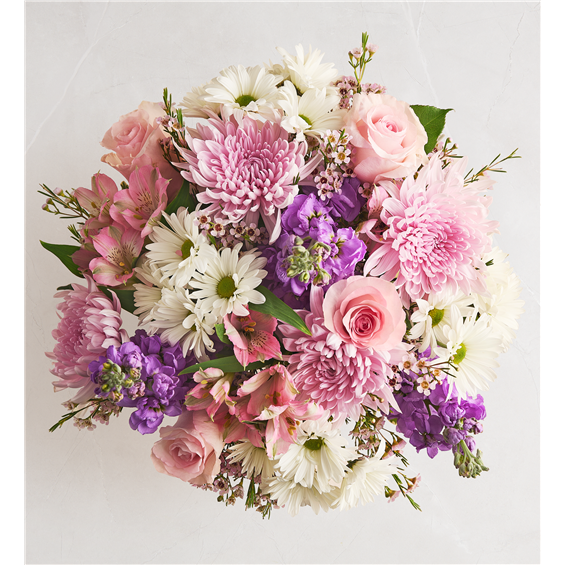 You know she’s amazing; now show her that you know. Roses, Peruvian lilies, daisy poms, and other lush blooms arrive artfully arranged in a lavender glass vase, resulting in a gift as beautifully splendid as she is. You also have the option to add a heart-shape LED pick with the sentiment “Amazing Mom.”